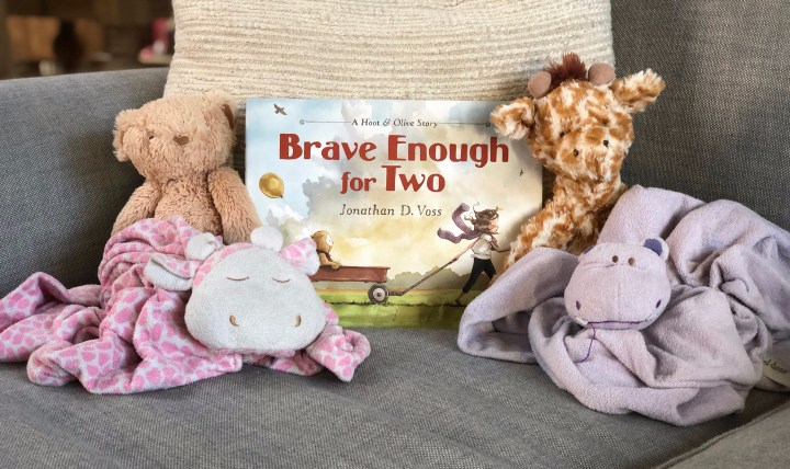 Do your kids have a special stuffed animal or blanket? One they adventure with? One that keeps them safe when they feel scared or nervous? Both of our girls do (while they loved the stuffed animals pictured above, their very special “loveys” are napping blankets from Angel Dear— the giraffe and hippo!). So, when our youngest received the book Brave Enough for Two for her 3rd birthday, it touched a special place in my heart.