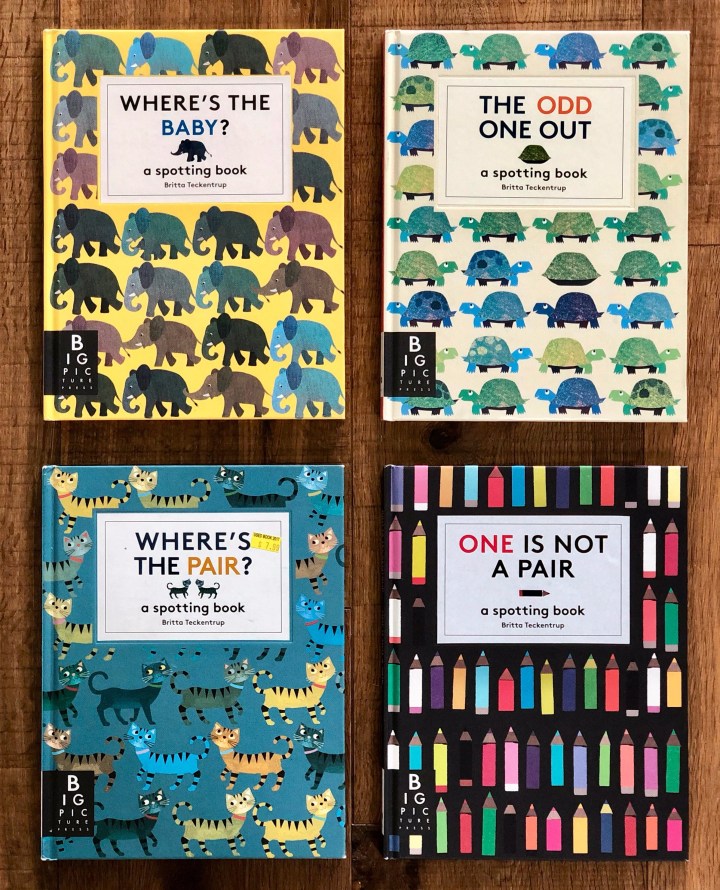 As of writing this post, Teckentrup has written 4 books in the “A Spotting Book” series, and we’ve collected all 4 of them for our home library over the last 6 months or so, starting when I found one (The Odd One Out) at our local library sale and fell in love with it! Once her name was on my radar, I grabbed Where’s the Pair? at a local used bookstore, and our wonderful local children’s bookstore was able to order the other 2 for me.