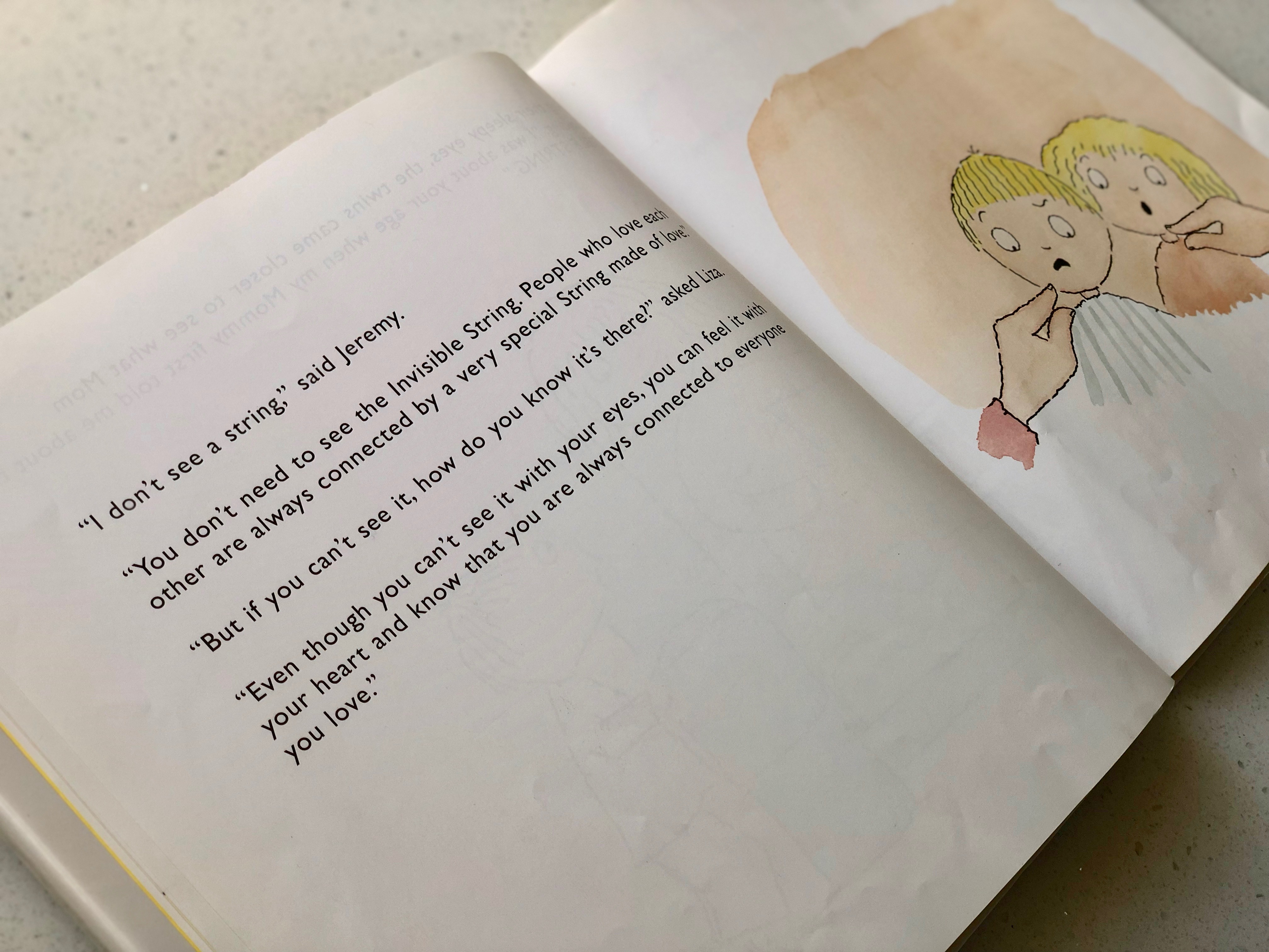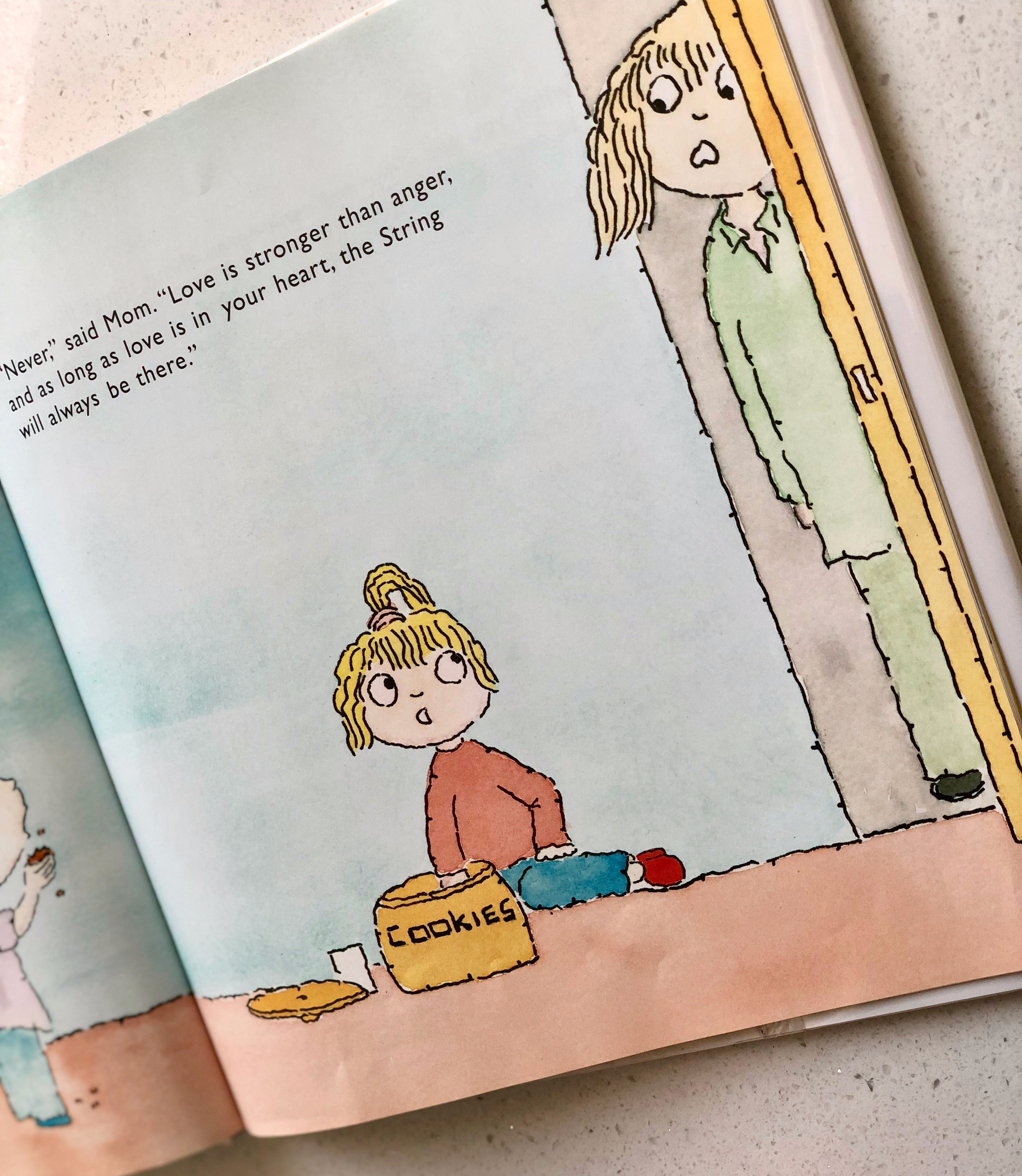 Children who read The Invisible String learn of the power of heart connections, connections they feel in a tangible way when they are apart from someone who is important. They may feel these “heart strings” being tugged when they’re scared or when they’re along. They may get pulled by parents, siblings, best friends, and teachers (my daughter’s class last year used to pull their Invisible Strings whenever someone was absent, to let them know they missed them and were thinking about them!). Karst tenderly connects these Invisible Strings to loved ones who have died, as well as addresses the important concept that “Love is stronger than anger, and as long as love is in your heart, the String will always be there.”