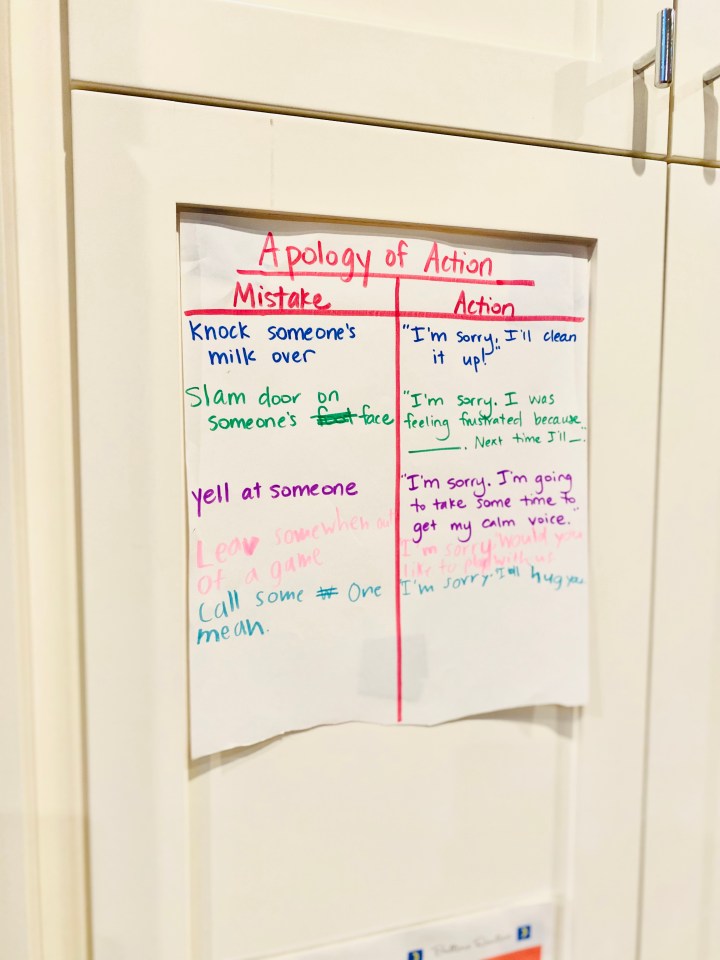And apologies of action take intentional teaching, modeling, practicing, reminding, and teaching again before children have internalized this language, thinking, and behavior. To that end, we used our family meeting last night to talk about apology of action, practice apology of action, and brainstorm possible actions for some common mistakes that we see in our house. Of course, we made a chart to hang in our kitchen!