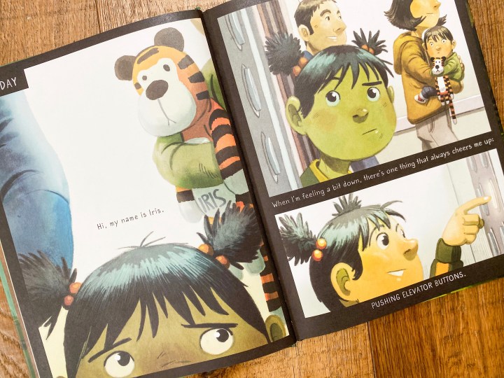 Meet Iris, the big sister in a family, with a very important job — to push the elevator buttons every time her family rides the elevator. Until, that is, the day that her little brother usurps her place in the family, not only stealing her beloved tiger toy, but also… pushing the elevator buttons! Iris’s way of expressing her jealousy and frustration (pushing every single elevator button the next time they ride…) doesn’t go over very well with her family. Feeling downtrodden and disheartened, Iris’s day turns around when she recovers an old elevator button from the trash, where it has been discarded during a repair. After taping it on the wall of her room, though, she discovers that this elevator button is no ordinary elevator button. In fact, it seems to serve as a magic portal, turning a normal closet door into a magic portal to amazing adventures beyond! Home is always waiting back where she found it, though, and it is this home and the family it holds that make Iris truly happy, not pushing elevator buttons.