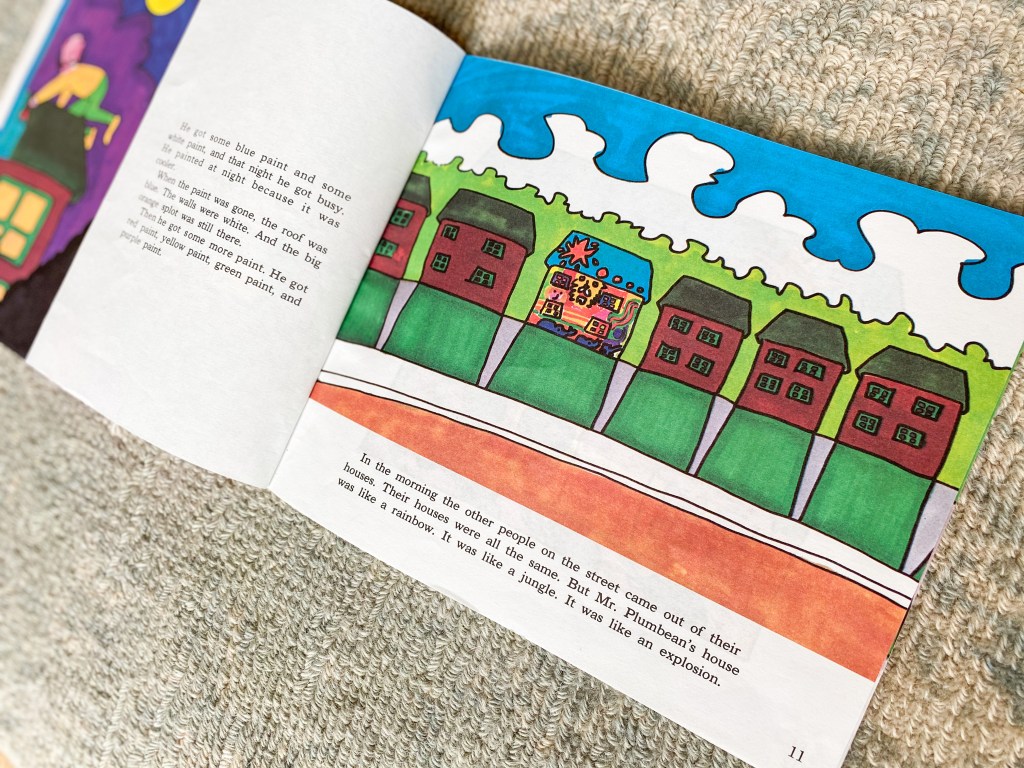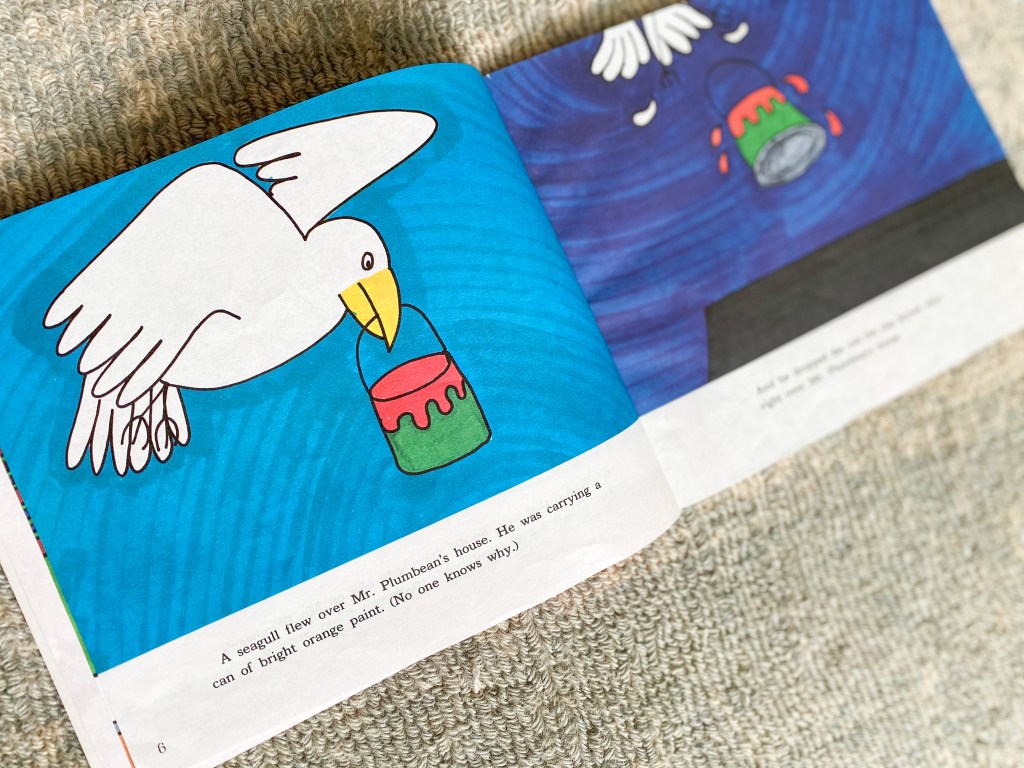 Mr. Plumbean lives on a neat street. And by neat, I don’t mean cool… No, this is a tidy, clean street, a street on which every single house looks the same. Until, one fateful day a seagull randomly drops a can of orange paint on his roof, and rather than immediately clean it off, Mr. Plumbean decides to leave it there (much to the dismay of his neighbors).