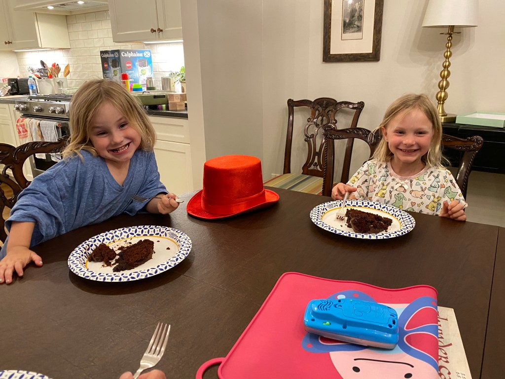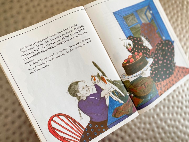 Be sure, as well, to notice the recipe for Thunder Cake at the back of the book! We took advantage of a stormy afternoon with grandparents earlier this summer to make our own Thunder Cake, and it was delicious! (And no, you can’t taste the tomatoes at all…).