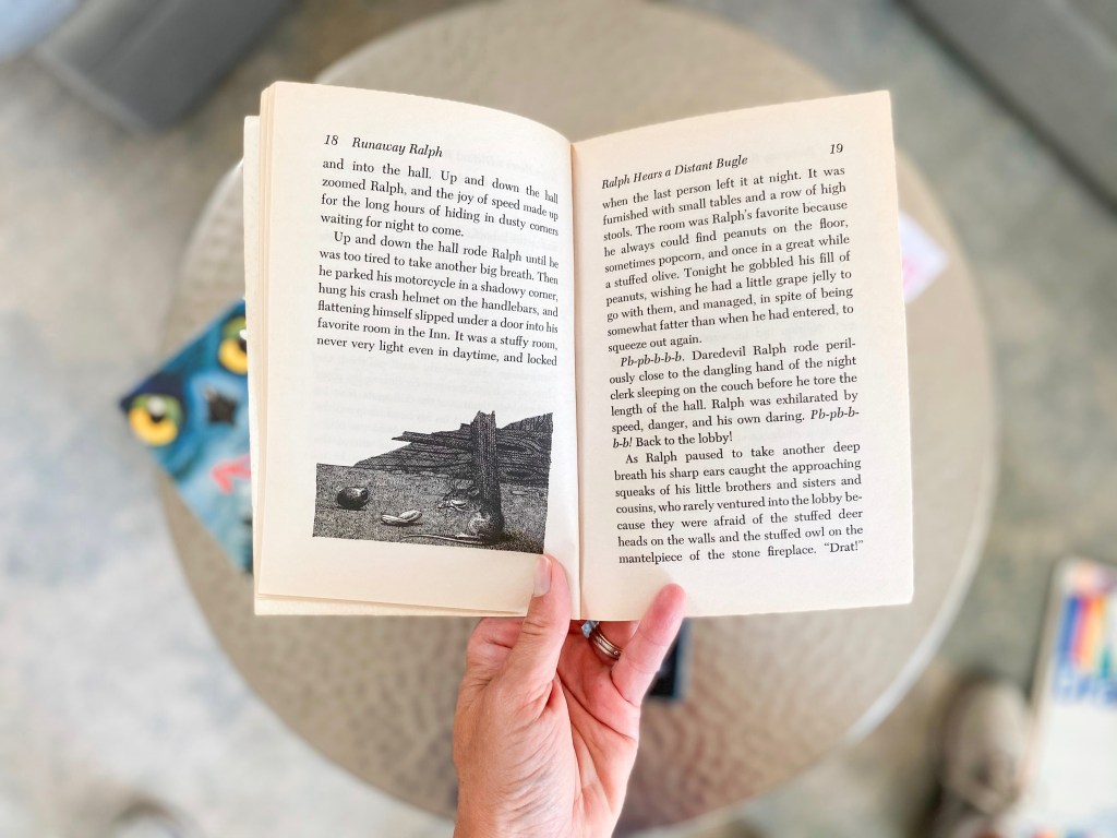 To start our unintentional mouse-themed read alouds, we read Beverly Cleary’s “Ralph” series. While the 2nd and 3rd books in the series survived my classroom years, I couldn’t put my hands on the first one, which is the only one I remember having read prior to this spring. And y’all, the “Ralph” series is delightful! Cleary started with The Mouse and the Motorcycle, in which we meet Ralph, a mouse who lives in a hotel. Ralph isn’t just any mouse, though… He can talk to special people, people who tend to be more quiet and introspective and without as many human friends. One day, a young boy with the best motorcycle Ralph has ever seen. When the boy falls sick and no doctor can be found, Ralph risks his life to save the day, earning ownership of the beloved motorcycle in return.