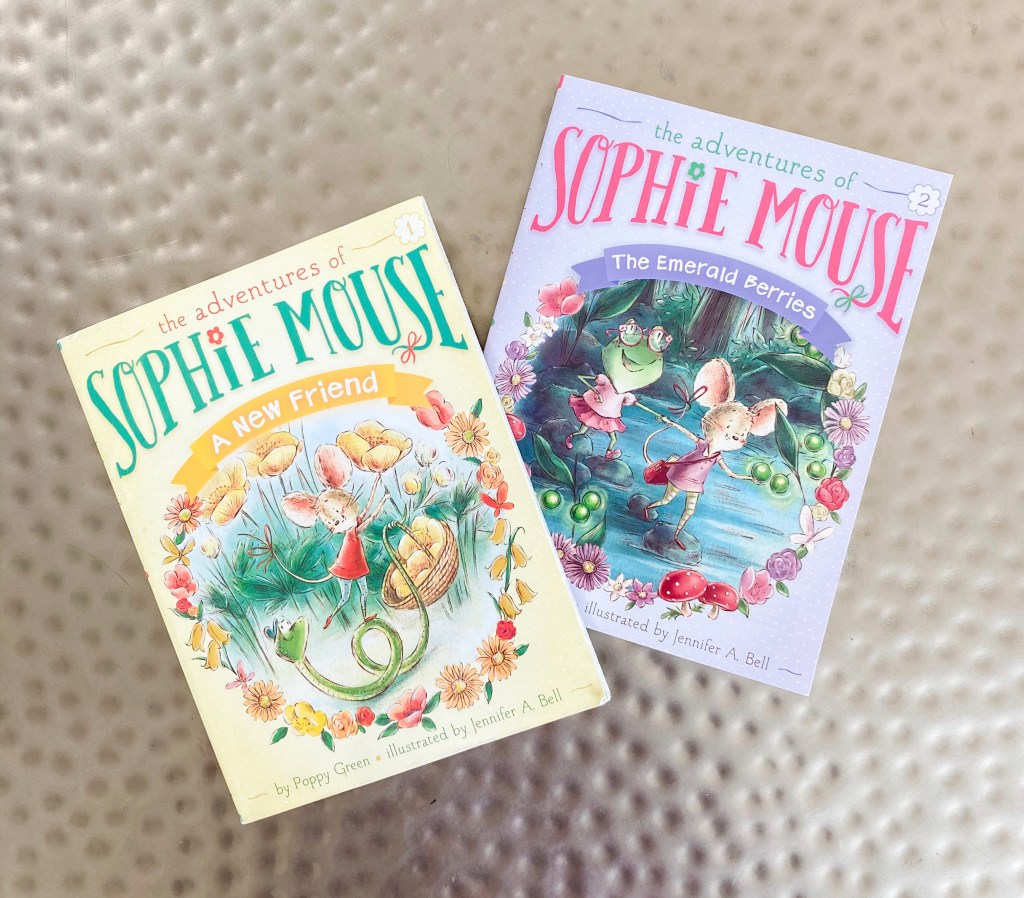 From there, we read most of the “Sophie Mouse” series by Poppy Green. Though only 2 books are featured, we read the first 6 books (Green has written 16 so far) and delighted in them all! Written with shorter chapters, a larger font, and illustrations on almost every page, the “Sophie Mouse” books are wonderful chapter books for newly independent readers. Sophie, the mouse and main character, has an incredibly kind heart and is a good friend to all around her, especially Hattie the frog and Owen the snake. The trio work their way through some sort of problem or adventure in every book, but the experiences are never scary. The friends’ positive traits such as kindness, hard work, and honesty get them through each challenge, yet the books don’t feel saccharine or didactic.
