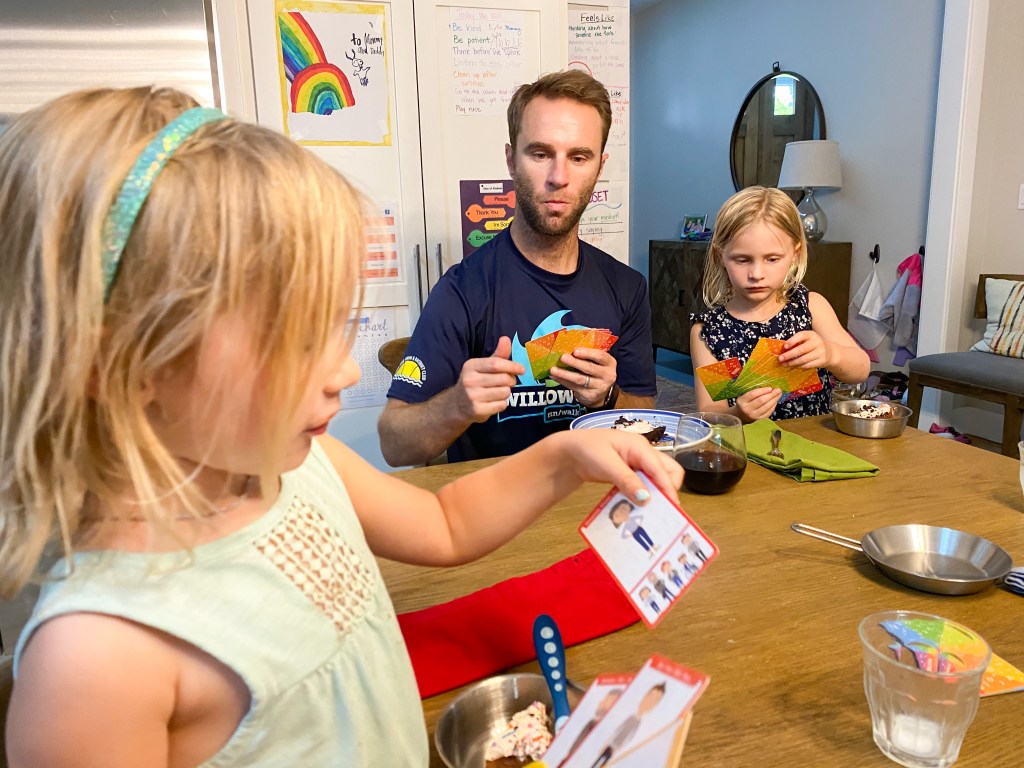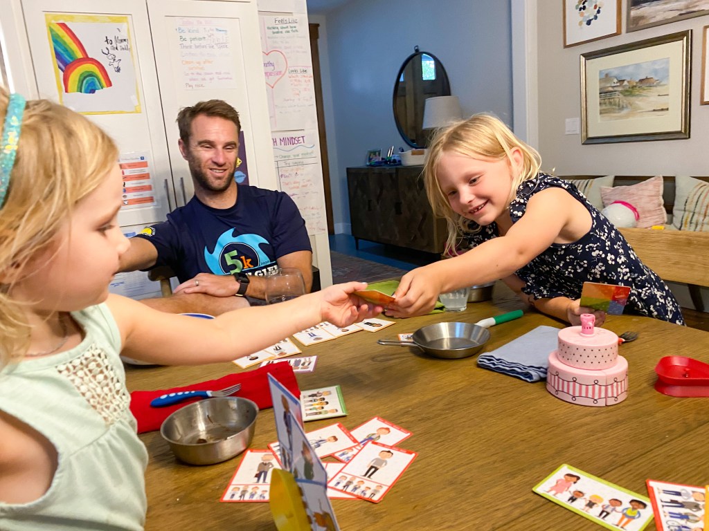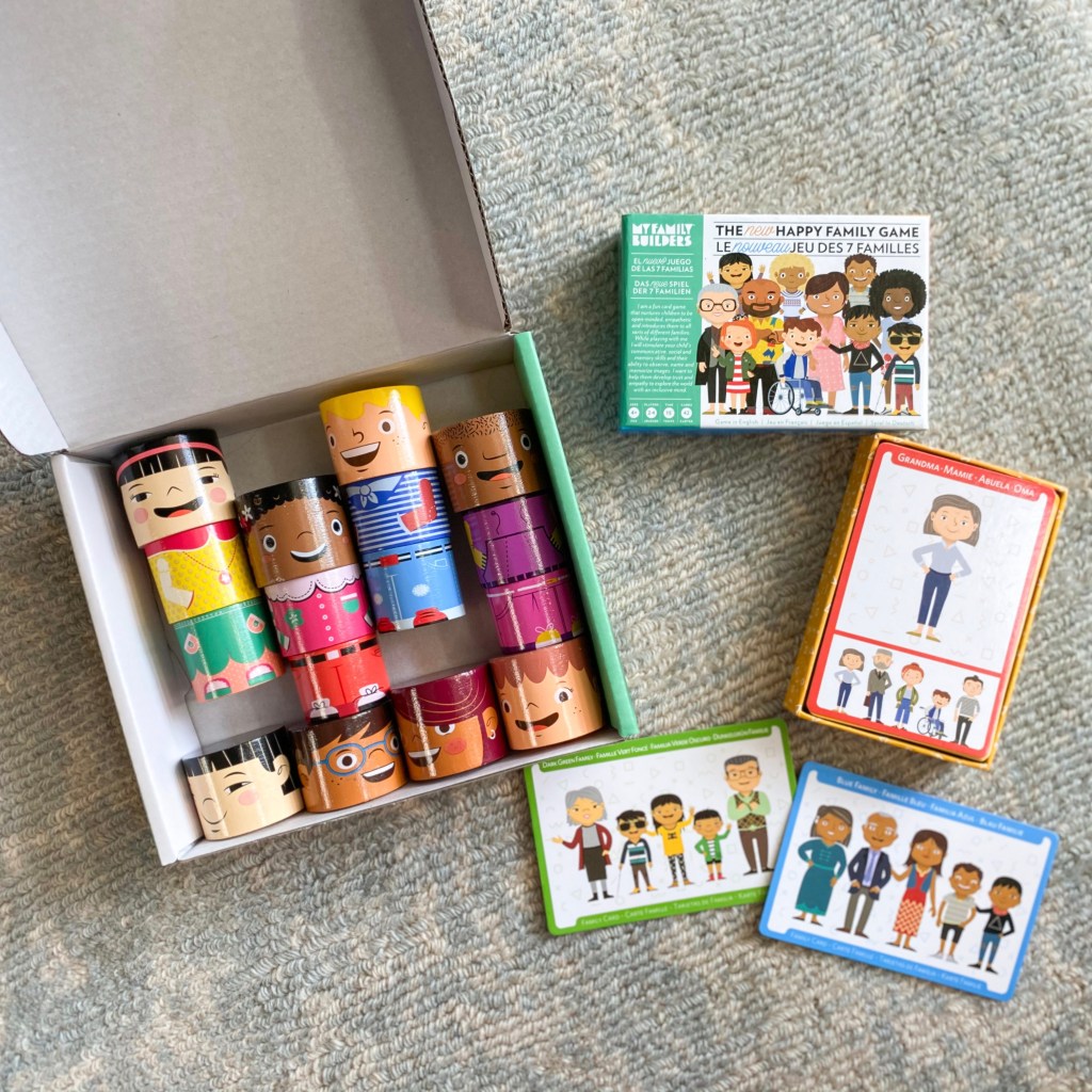 And the game! For those of you who know us well or have followed me for a bit, you might remember that our older daughter really, really, really does not like to play games. Board games, card games, dice games… If given a choice, she’ll opt out every single time. But y’all, she LOVES the Happy Family Card Game! The cards come with directions that allow you to play two different ways; thus far, we’ve always played the “Go Fish” variation, and it’s a huge hit with all 4 of us. As with the blocks, the 7 families represented in this game are incredibly inclusive. When my non-game-playing children ask to play a game every single night, and that game promotes “teachable moments about race, cultural diversity, inclusion and stereotypes,” then I’d say that’s a win!