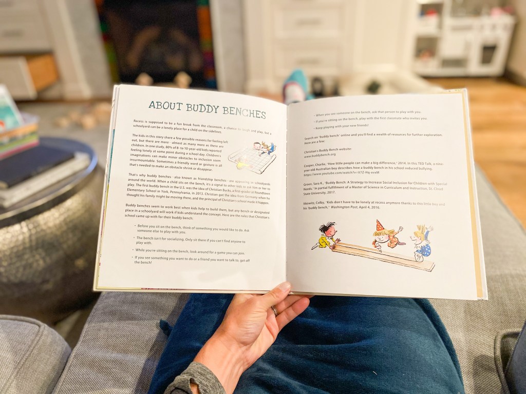 Now I’m curious — does your school have a Buddy Bench? I’m really hoping if we read this enough that my girls will start a Buddy Bench movement at their school when they go back in person!