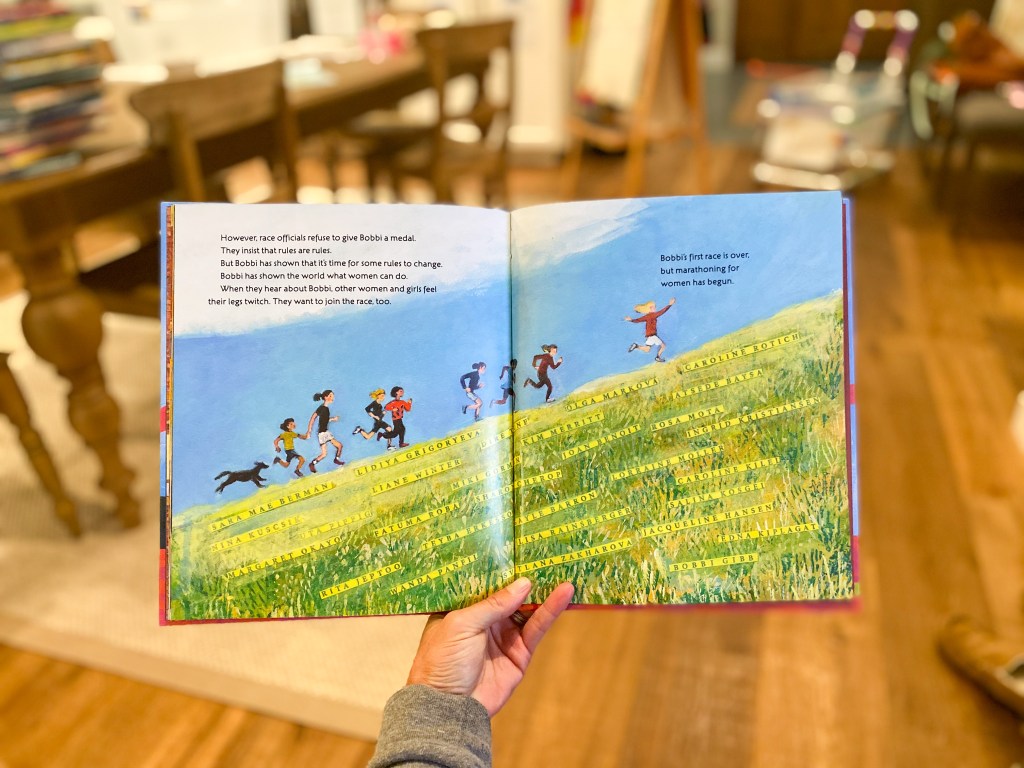 Did you know that though the first Boston Marathon, the world’s oldest annual marathon, was run in 1897, women weren’t officially allowed to enter the race until 1972? And, did you know that the oldest person to complete a marathon was 108 years old??? We bought Girl Running: Bobbi Gibb and the Boston Marathon last winter, and it was one of the most requested read alouds in our house throughout the spring…