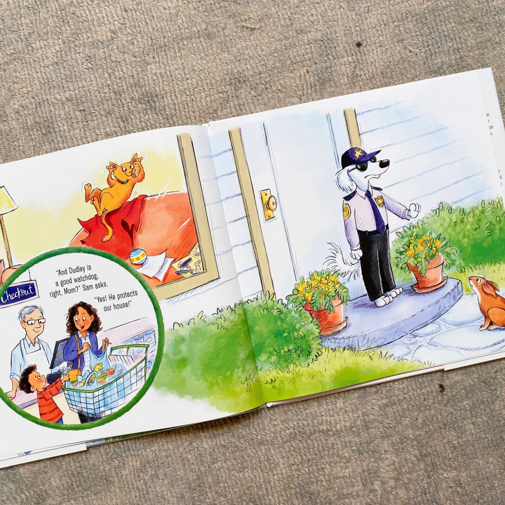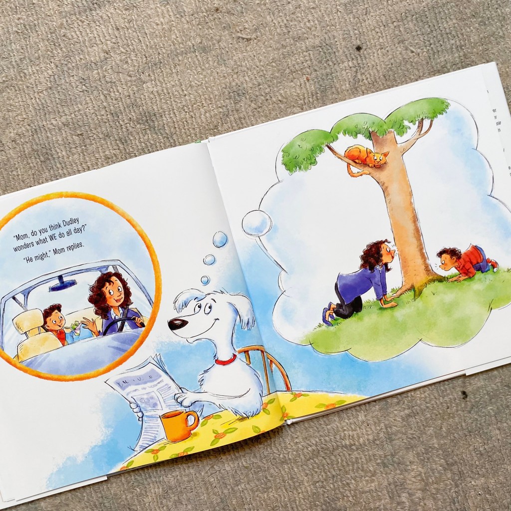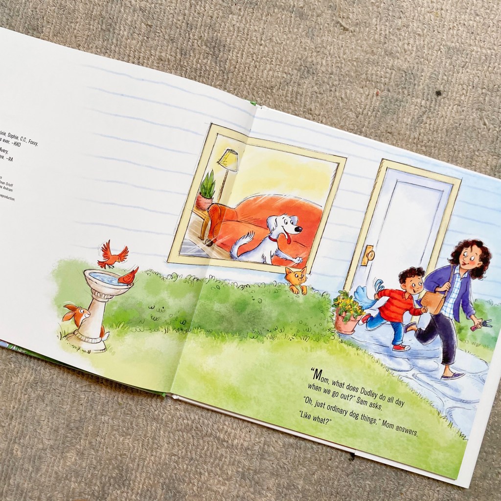 Meet Sam, curious kid, son to Mom, and owner of Dudley, the exuberant dog. As they are leaving the house one day, Sam asks his mom, “What does Dudley do all day when we go out?” Ah yes, the eternal question of families with pets… What on earth do they do when we’re not around? Do they really just sleep on their pillows all day? How do they play and keep themselves entertained if we’re not around?