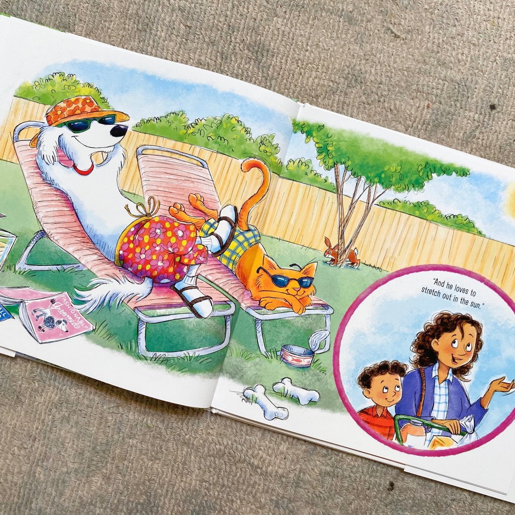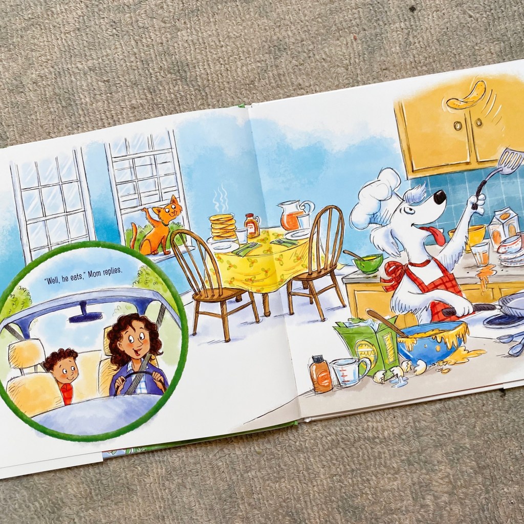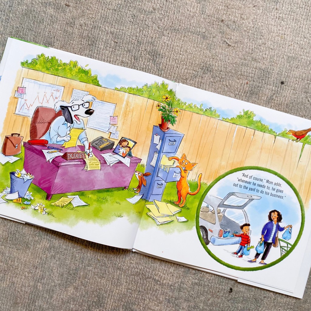 As Mom gives Sam standards answers of eat, play, and sleep, we see Sam’s interpretation of these answers… We see visions of Dudley making pancakes, playing checkers, and curling up in a proper bed for a nap. Our favorite page is when Mom reminds Sam that Dudley probably needs to go out into the yard to “do his business,” a common phrase for dog owners… But Sam’s vision of Dudley’s business is quite different!