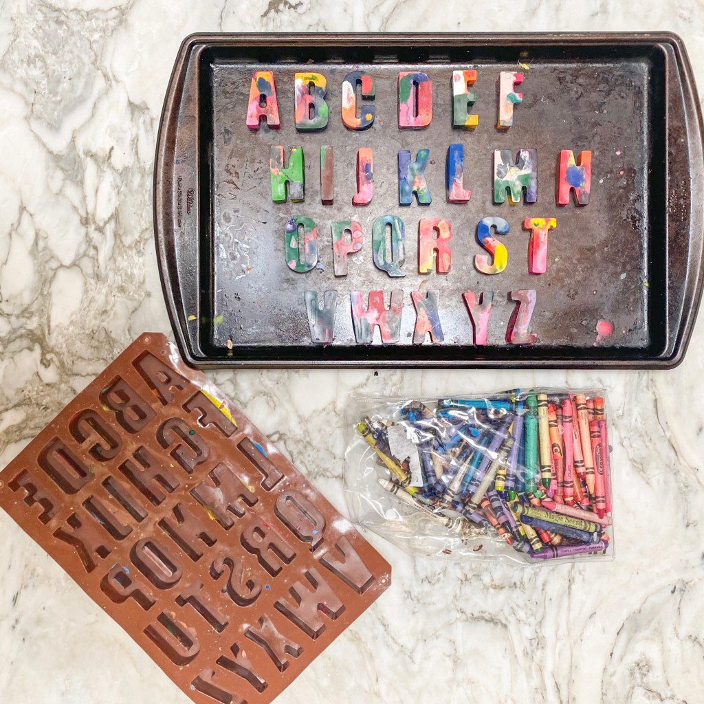 A few weeks ago, I posted a few Instagram stories about our girls recycling their old crayons to make crayon “letters” to give to cousins and friends as gifts, and I had TONS of questions about how to do this and requests for instructions! So, here you go — instructions on how to make DIY recycled crayon “letters!”