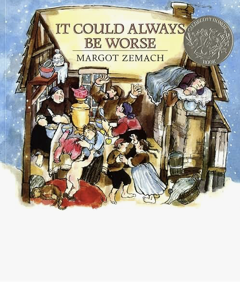 It Could Always Be Worse by Margot Zemach — A Yiddish folktake retold and illustrated by Zemach, this one will have you laughing through it, but pausing thoughtfully at the end as the Rabbi’s message sinks in. A “poor unfortunate man” lives in a one-room hut in a small village, with his mother, his wife, and his 6(!) children! Life is hard, and the hut is crowded, noisy, and full of fighting. When he can’t take it any more, the man runs to the local Rabbi for help… And to his bewilderment, the Rabbi has him bring his animals in the hut also, one by one… Until one day, the Rabbi’s advice changes, and the man is able to see the true pleasures in his life. Ages 3-6.