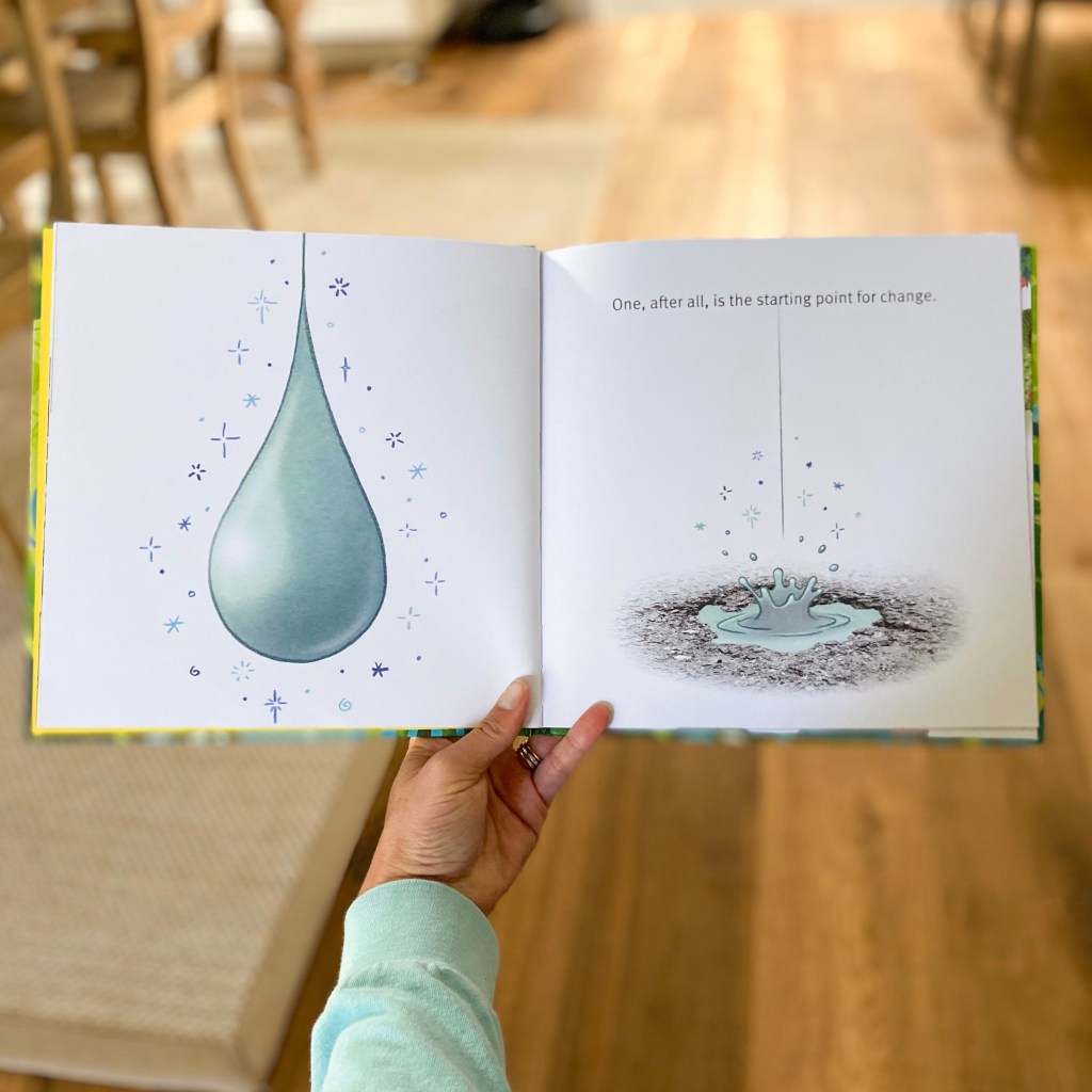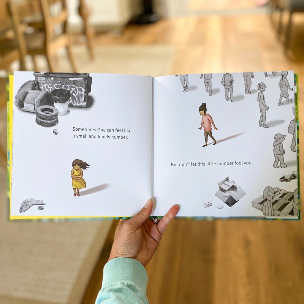 From there, Ludwig and Curato take us on a journey, but literally and metaphorically, through various ways that One can make an impact. From one drop of rain starting a puddle, one flower blooming in a trashed, run-down park, and one apology to heal past hurts, we see both a beautiful park and a close-knit community grow. As the story closes with the community coming together for a feast in the bountiful garden, gathered around a table (conveniently) shaped like the number “1,” Ludwig reminds us that “acts and words of kindness do count… And it all starts with One.”
