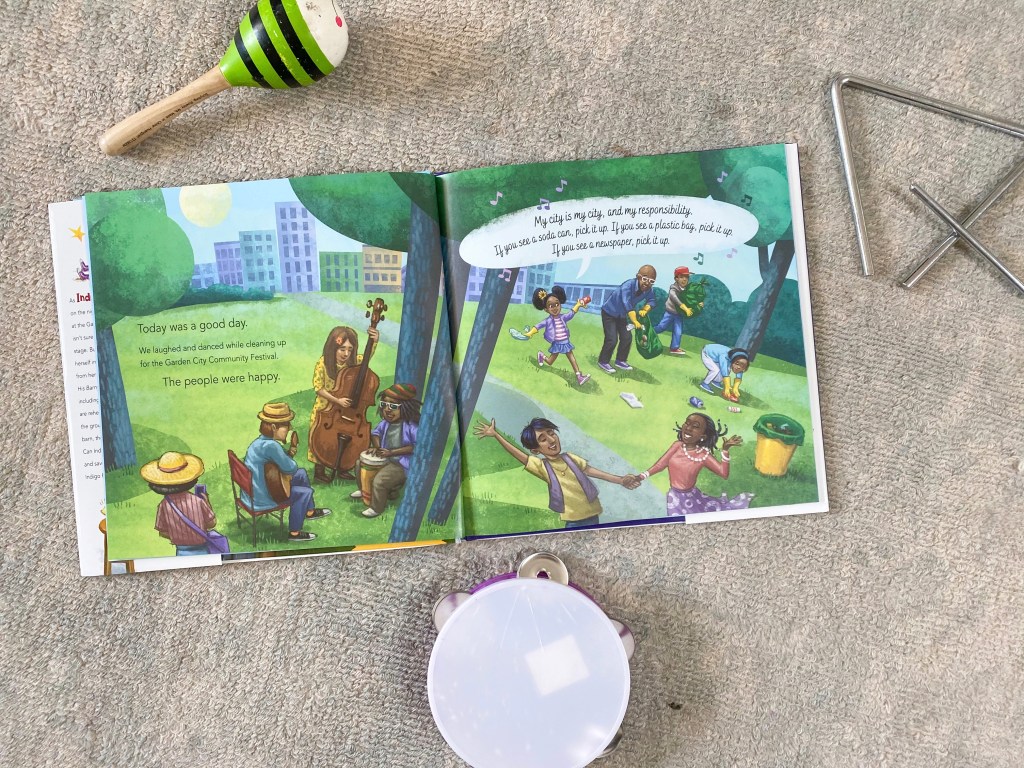 Acoustic Rooster and his band (this time starring Dairy Parton, which is almost amazing enough to make me love this book solely based on that!) are back in Acoustic Rooster’s Barnyard Boogie Starring Indigo Blume , but they take backstage to Indigo (from another Alexander book, Indigo Blume and the Garden City) herself. Indigo finds herself overcome by nerves the day before she is supposed to sing at the Garden City Community Festival, and that night, dreams a very strange dream… Which takes her inside her favorite book — you guessed it, Acoustic Rooster and His Barnyard Boogie! When Acoustic Rooster’s farm is torn apart by a “hurritrain” (which makes our five-year-old crack up every time we read it), Indigo and the animals decide to have a fundraiser concert to raise money to rebuild. But, when Dairy Parton loses her voice, will Indigo find the courage she needs to step in and sing in her place?