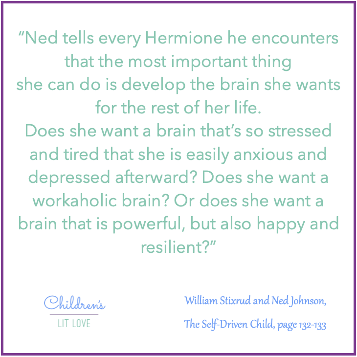 Chapter titles range from “‘It’s Your Call’: Kids as Decision Makers” and “Radical Downtime” to “Wired 24/7: Taming the Beast of Technology” and “Who’s Ready for College?” and everything in between. You learn about how to deal with homework, the most important aspect of your home environment, standardized tests, stress, play, and more. In addition, Stixrud and Johnson back every bit of this book up with neuroscience research and cite studies all along the way!