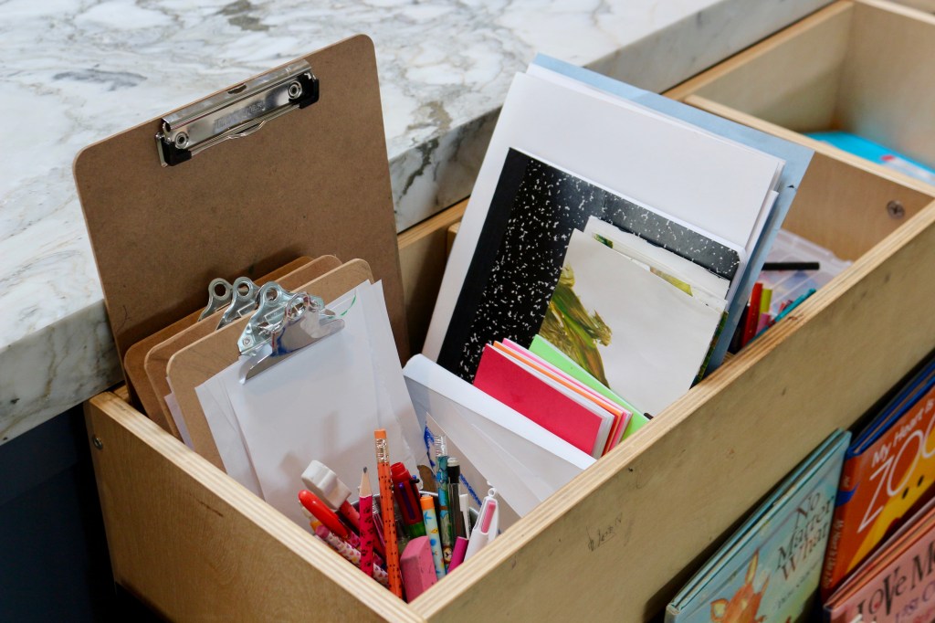Whatever you choose, keep its location in mind as you bring it into your house and find a place for it to live. Just like with the books we want our children to read, writing tools need to be accessible to children so that they can actually use them. Our beloved front-facing bookshelf has storage compartments on the top, so our children always have access to clipboards, paper, pencils, pens, markers, and notebooks (yes, even markers… and they’ve had everyday access to them since our older daughter was tiny… they’re actually pretty unlikely to ever draw on walls or furniture, and if they do, that’s a situation ripe with logical consequences to help them learn!). Our letter stamps, alphabet stickers, staplers, crayons, colored pencils, and more all live in a nearby art drawer, where the girls can get them whenever they want.